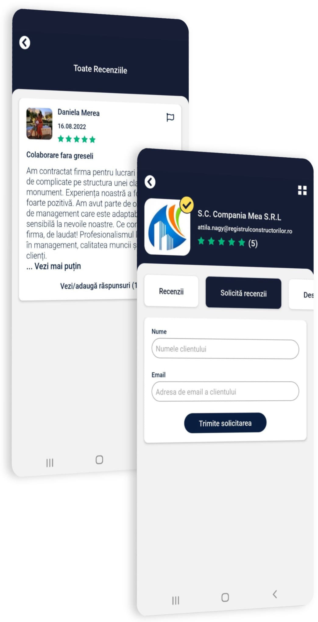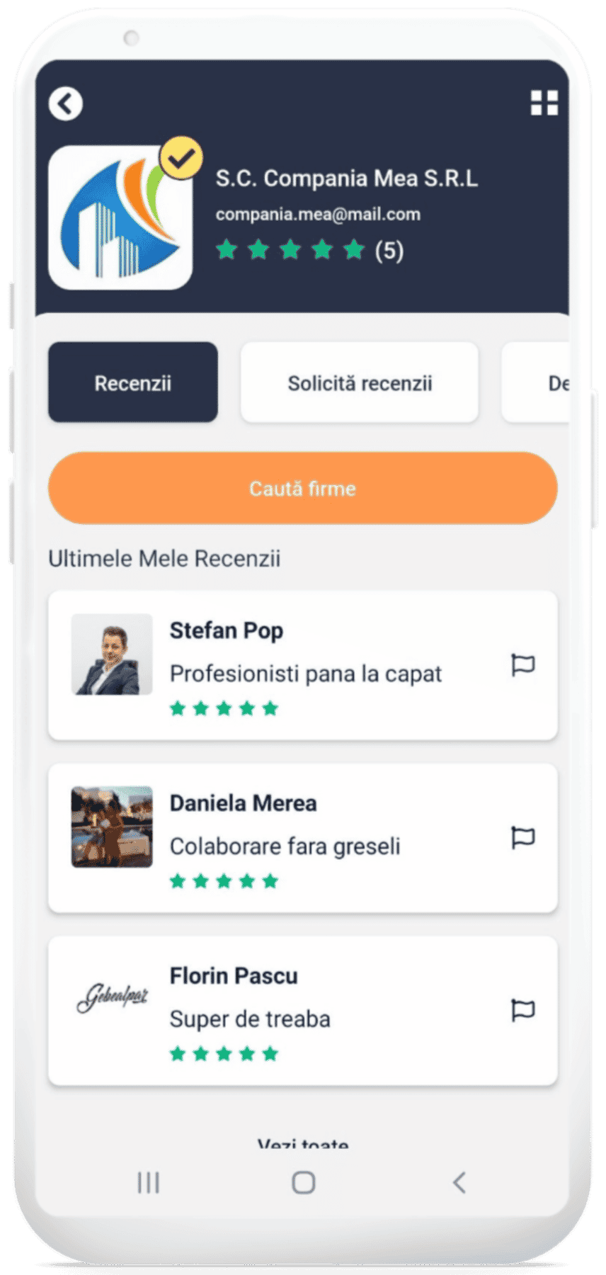 Nu lăsa reputația firmei tale la voia întâmplării. Afișează și administrează cu ușurință recenziile despre firma ta folosind funcțiile noastre inovatoare de colectare și afișare a recenziilor.